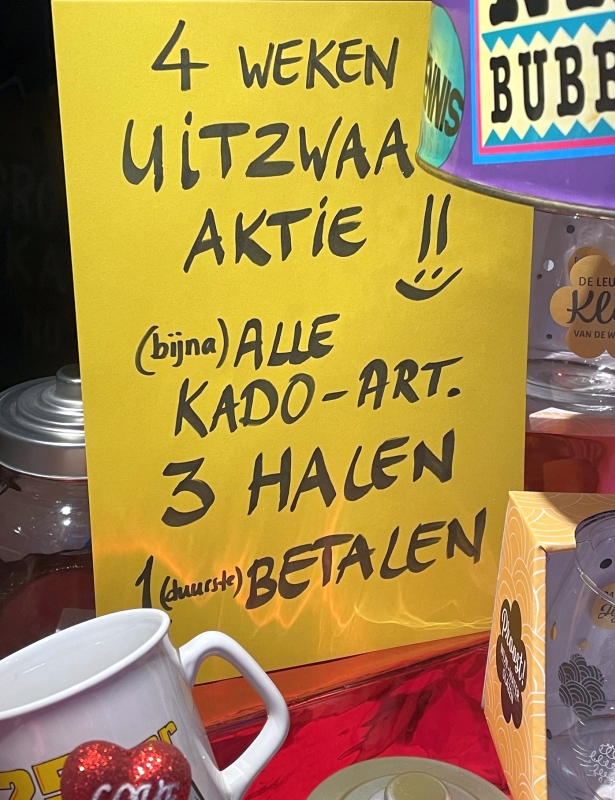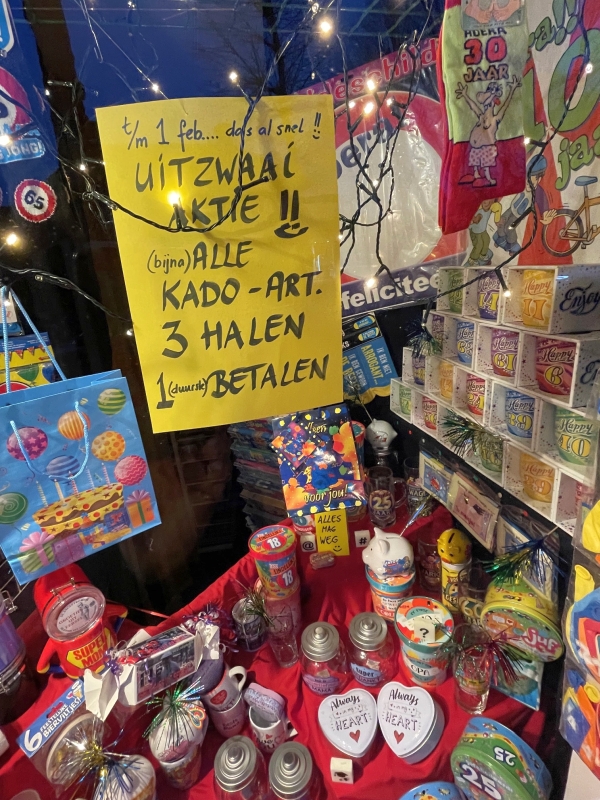 De komende maanden zullen we vooral cadeauartikelen in de opruiming doen. Maar we behouden tot het laatste moment een ruim assortiment met ouderwets en eigentijds snoepgoed en natuurlijk volop keuze voor de kinderen.